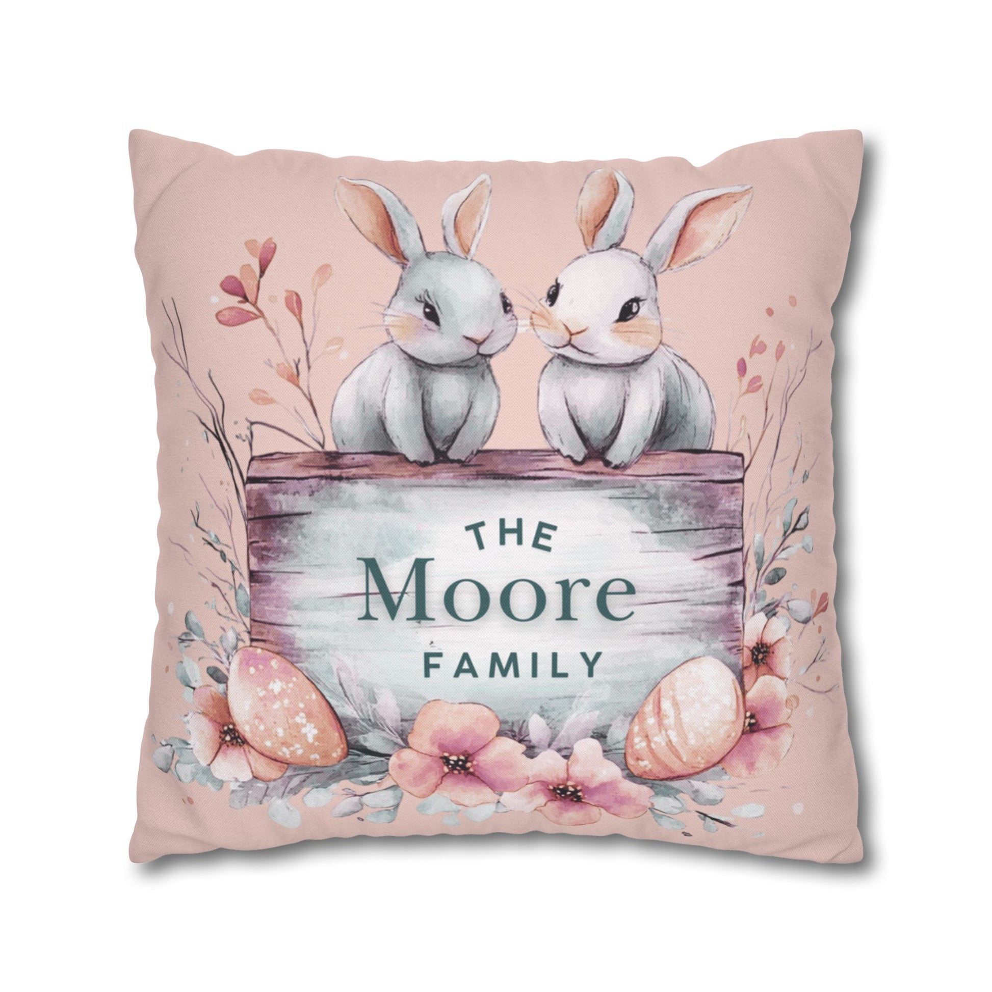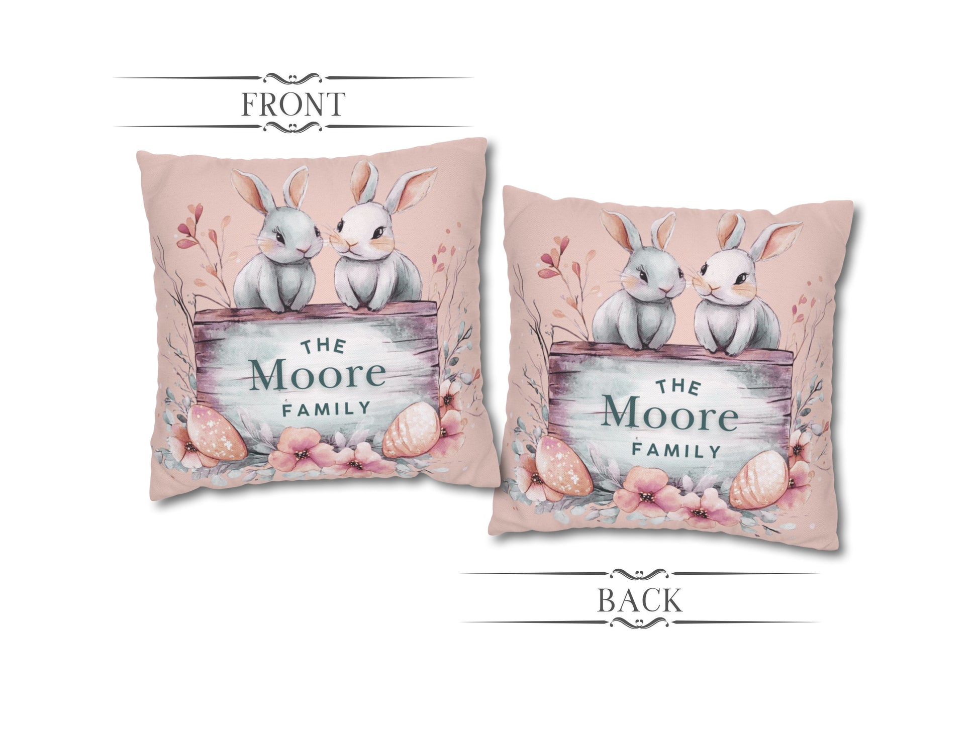 This personalized peach Easter throw pillow cover features bunnies and a customizable family name, double-sided, making it a unique and festive addition to your Easter home decor.