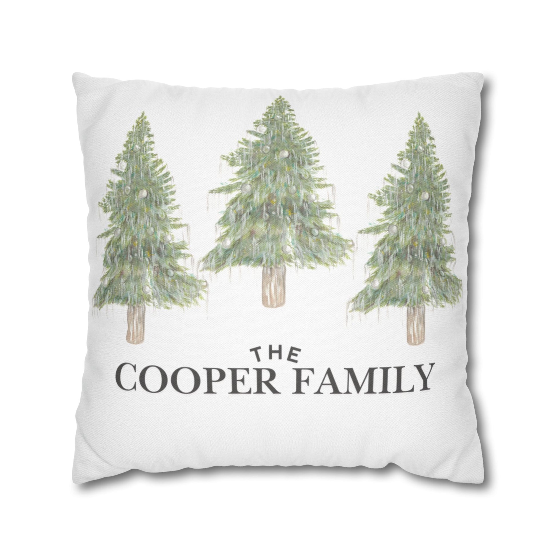 This personalized Christmas throw pillow cover features watercolor Christmas trees with beautiful tinsel and a customizable family name, making it a unique and festive addition to your Christmas home decor.