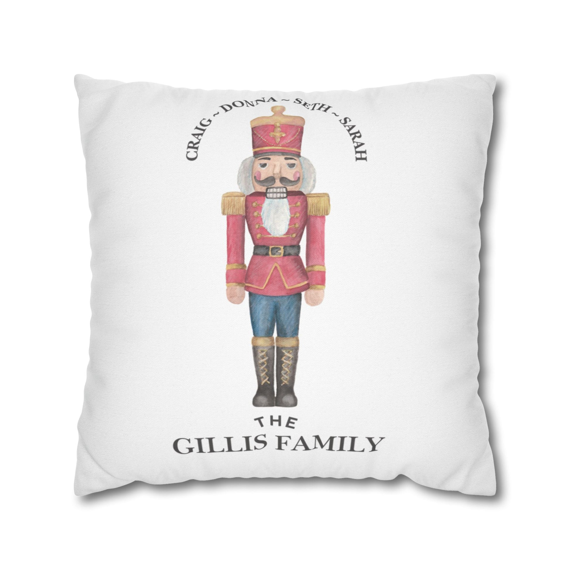 This personalized Christmas throw pillow cover features watercolor nutcracker soldiers and a customizable family name with first names, making it a unique and festive addition to your Christmas home decor.