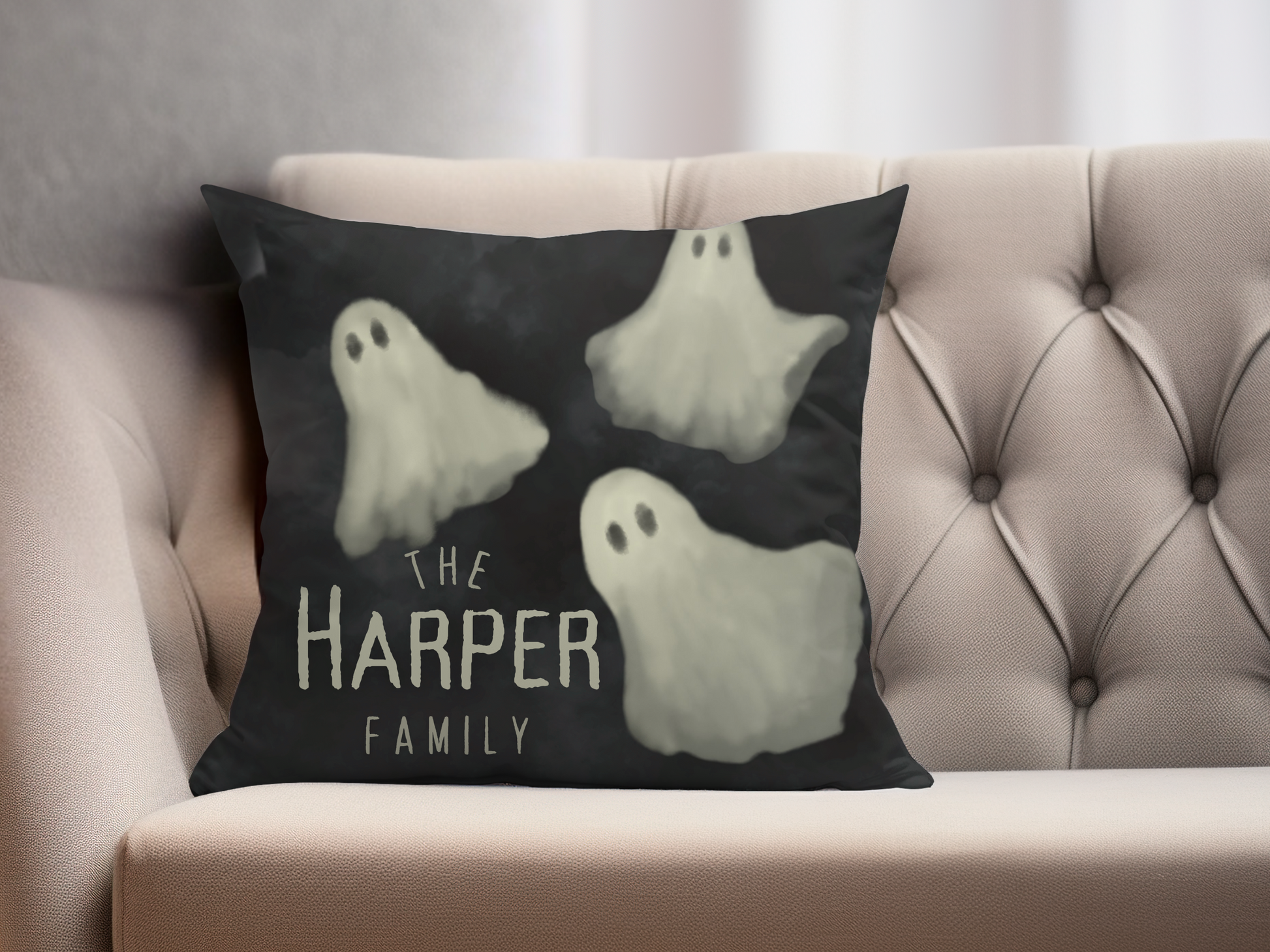 This personalized Halloween throw pillow cover features spooky ghosts and a customizable family name, making it a unique and festive addition to your Fall home decor.