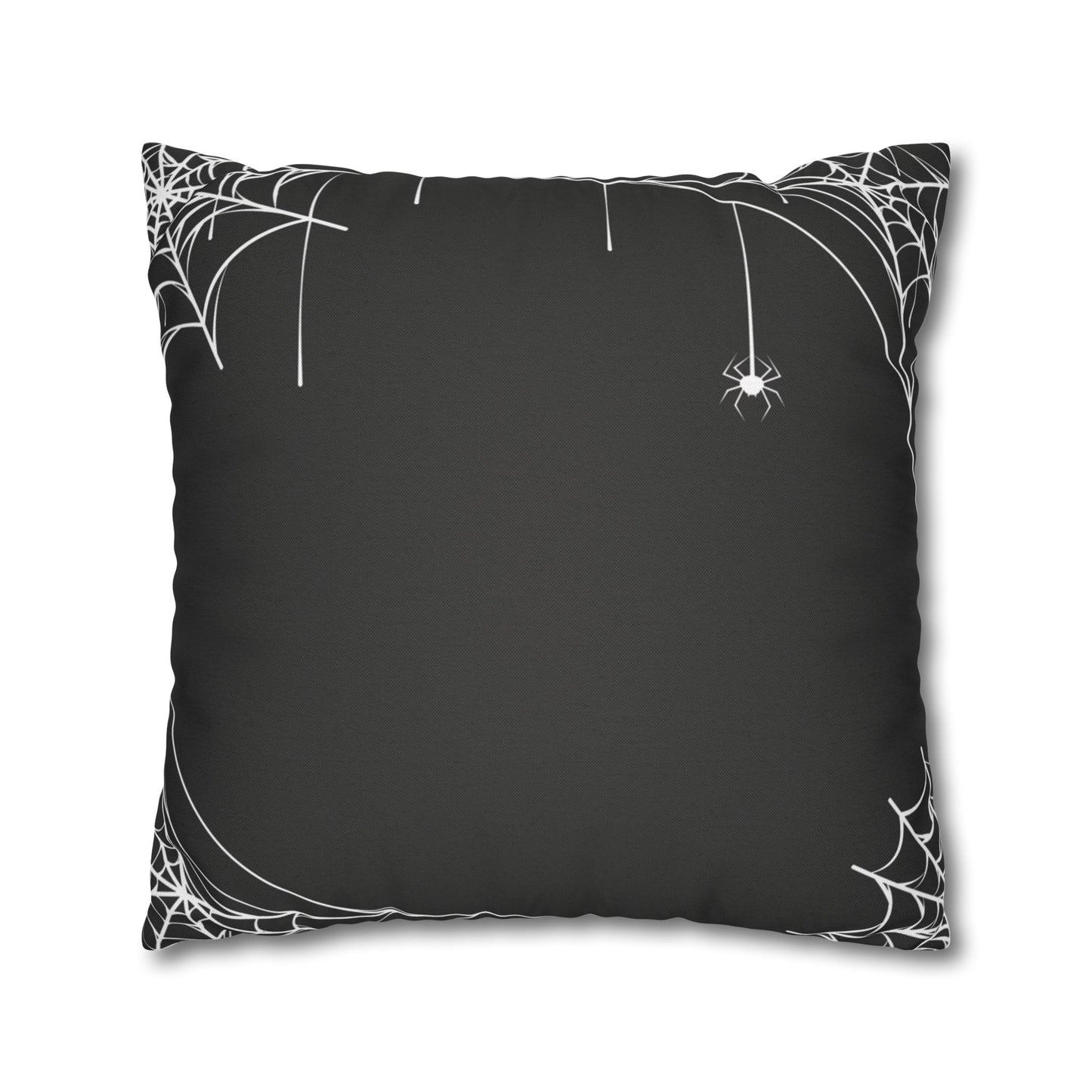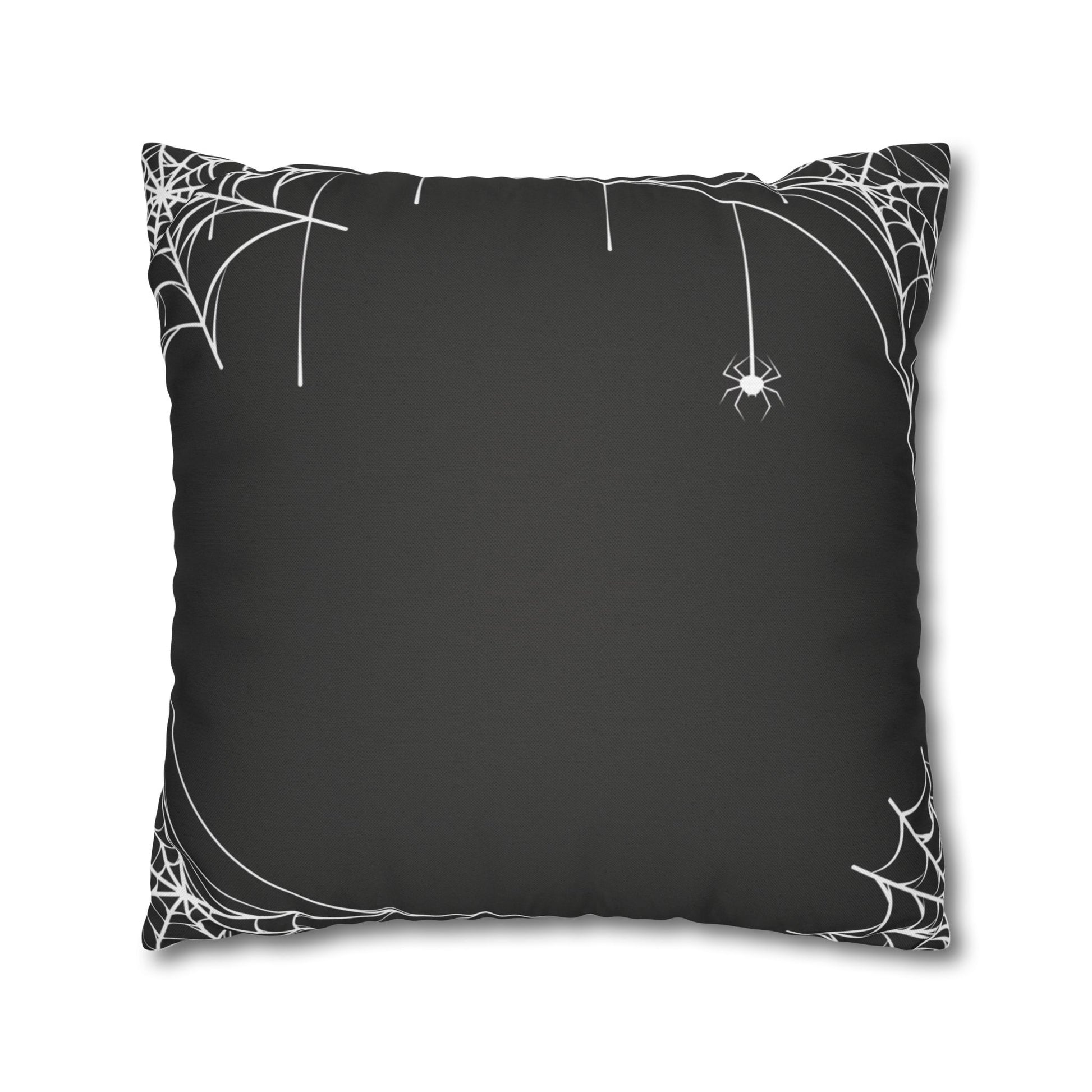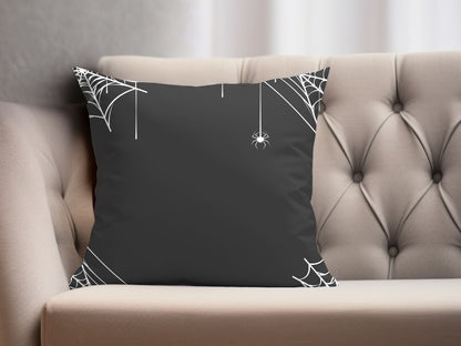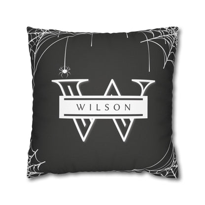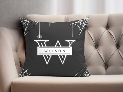This personalized Halloween throw pillow cover features a white spider on spiderwebs and a customizable family name, making it a unique and festive addition to your fall home decor.